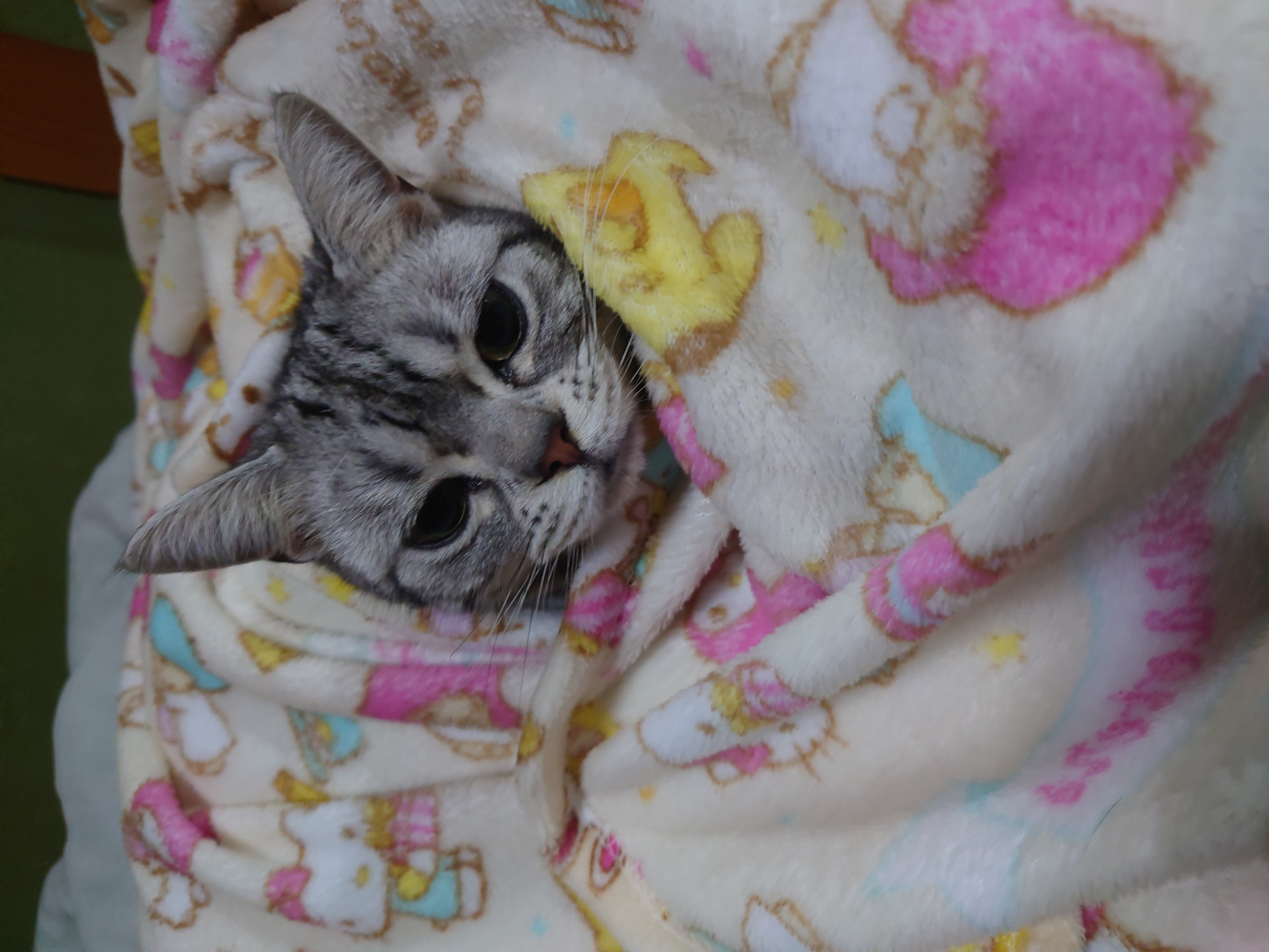 眠いし寒いのでされるがままに毛布に包まれています。ぬくぬくして更に眠くなっちゃうね。